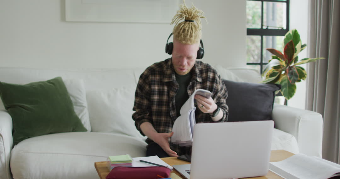 An albino African American man with unique dreadlocks is sitting on a comfortable living room couch while intensely reading documents. He appears deeply focused and wears black headphones, signifying remote work or study. The airy, light-toned room is casually styled, making the scenario relatable for digital nomads or anyone embracing a flexible work setup. Use this video for illustrating the essence of home offices, remote working environments, digital learning, and highlighting diversity in modern workspaces.
