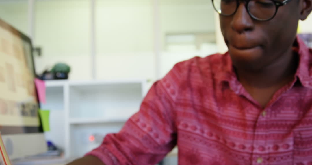 African American graphic designer is focused on work at his desk, emphasizing creativity and professionalism in a modern office environment. Ideal for depicting diverse workplaces, productivity, or technology-related content.