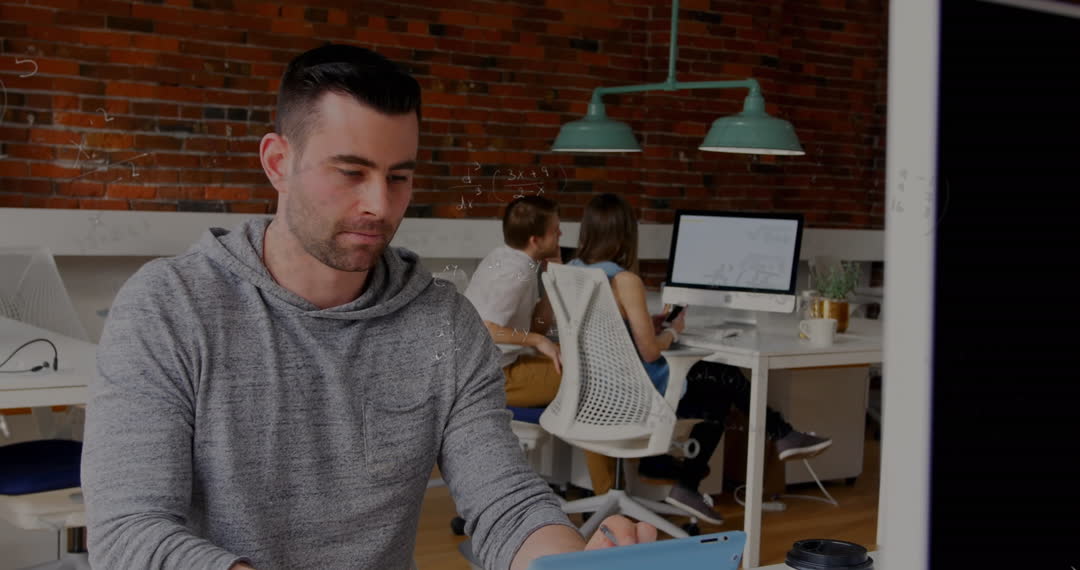 Caucasian man works attentively at a laptop in a modern office with mathematical equations overlay indicating analyses and strategy. Open-floor workspace features brick wall and industrial lighting, offering technological and calculated business concepts. Ideal for themes in digital innovation, problem-solving, or collaborative environments.