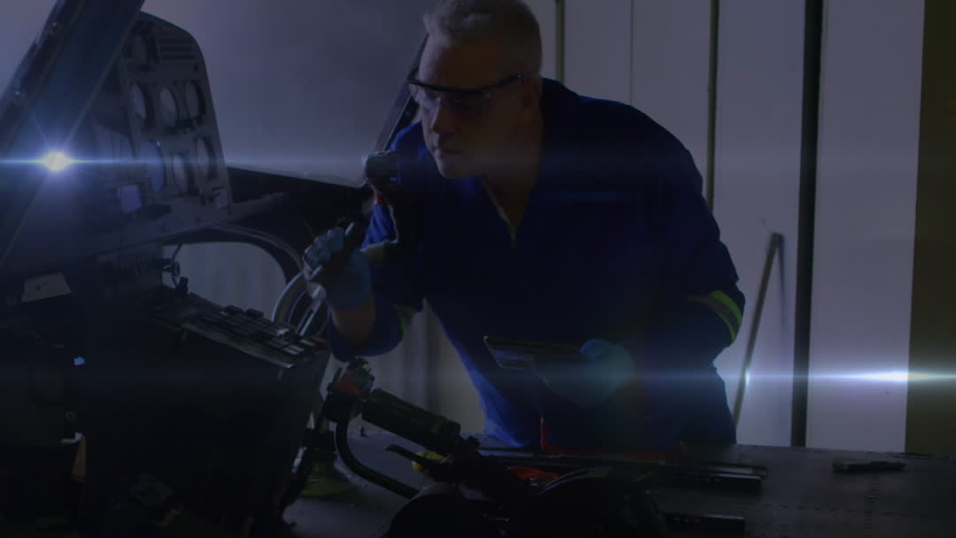 Mid-aged caucasian male mechanic performs detailed maintenance in workshop under dim light, adding intensity with engaging light trails via special digital animation effects. Enhancing auto repair-themed videos or marketing ads through highlighting concentration and professionalism in mechanical settings offers captivating depiction of pragmatic specialization.