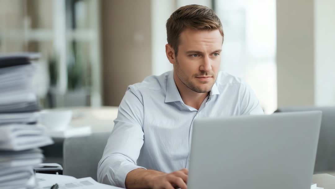 AI Generated Image. Video frame shows professional in a modern office environment, working diligently on a laptop. Stacks of paper indicate a productive atmosphere, highlighting elements of focus and task management in a business setting. Useful for depicting themes of work efficiency, office routine, or showcasing a contemporary workspace for business-related content.