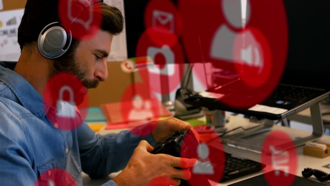 Caucasian man in an office concentrating on digital media, surrounded by technology icons. This visual symbolizes modern digital connectivity and multitasking in business settings. Ideal for illustrating technology-centric articles, business intelligence presentations, or software usage demonstrations.
