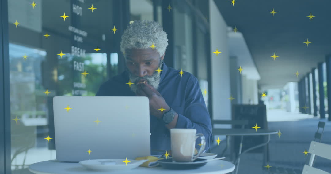 Depicts focused professional engaged with work in a modern cafe while enjoying snack and coffee. Eye-catching digital star effects add a creative twist, suggesting innovation or technology themes. Ideal for illustrating concepts of remote work, technology in business, or casual productivity in urban settings.