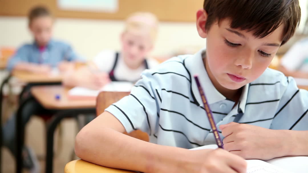 A young boy attentively writes in a notebook, surrounded by classmates who are also focused on their tasks. This can be useful in educational materials to highlight focus during class, study techniques, or educational products marketed towards parents and schools. The video can illustrate advertisements or promotional materials for school programs and study guides.
