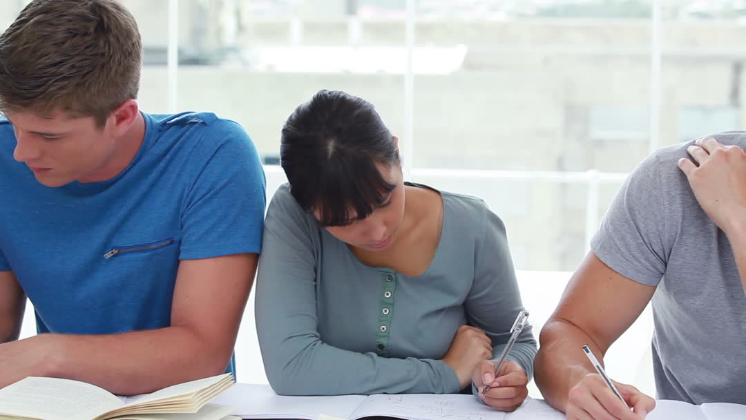 A group of students is deeply engaged in their studies in a well-lit classroom environment, suggesting collaboration and focus on academic tasks. Ideal for use in educational materials or websites highlighting study habits, teamwork, and academic pursuits.