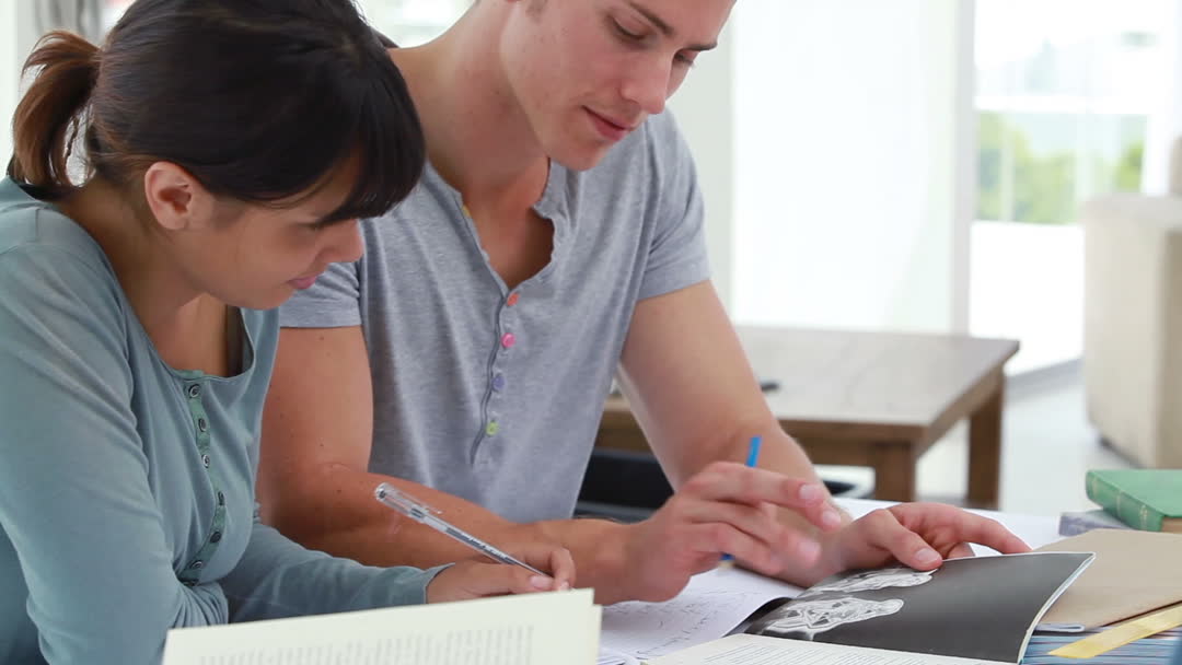 Two students are collaborating closely on their studies, surrounded by books and notes in a well-lit study room. This video can be used for educational websites, college advertisements, brochures about academic services, or articles on effective study techniques.