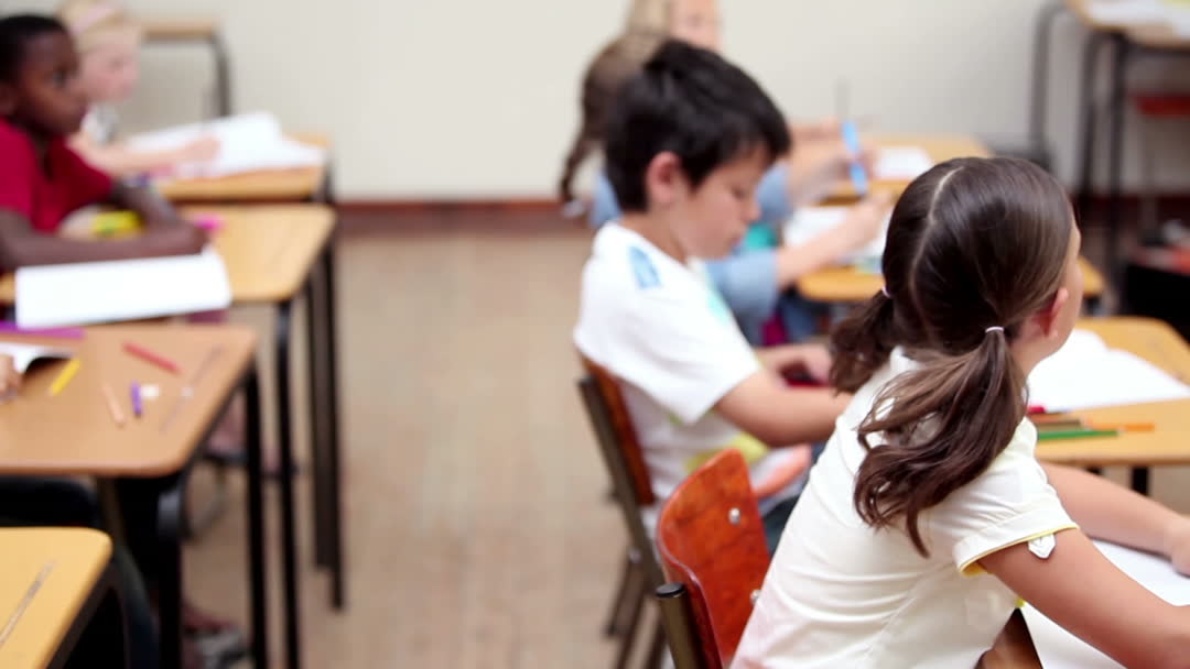 Children are shown intently working at their desks in a classroom featuring wooden furniture. The students seem keen on their tasks, indicating an attentive educational environment. Use this video for educational websites, school brochures, or articles emphasising the importance of focused learning in school systems.