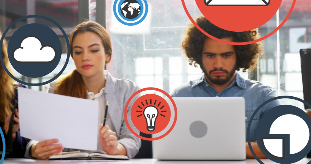 Office environment where diverse coworkers are intensely focused on examining reports with an overlay of various technology icons related to globalization and cloud computing. Great for illustrating collaboration in a tech-driven workplace. Ideal for use in business and technology presentations, articles about modern workplace dynamics, or materials promoting digital transformation initiatives.