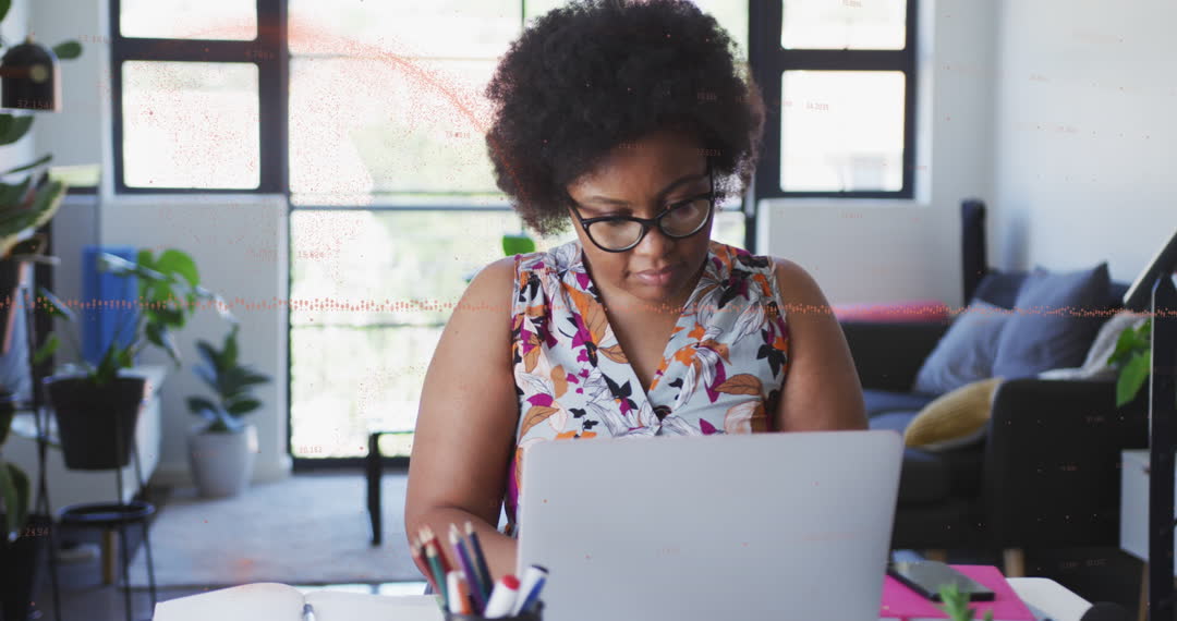 African American woman in glasses using laptop in modern office space with plants, focused on financial data analysis. Suitable for illustrating remote work trends, using technology in business settings, financial analysis, or lifestyle productivity themes. Could be used in articles about digital transformation in workplaces or personal productivity in modern office environments.