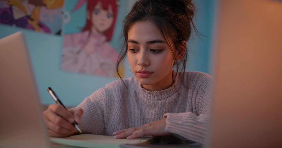 - Focused Woman Taking Study Notes in Art-Inspired Study Space