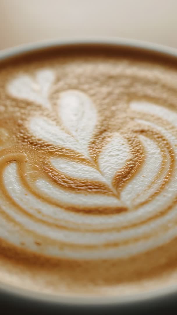 AI Generated Video. Showing closeup vertical video of latte cup while focusing camera revealing rosetta heart foam and rippled crema texture. Macro framing capturing rich caramel tones, silky microfoam, ceramic rim and shallow depth creating soft blurred background. Offering calming, tactile visual mood for morning coffee themes and gourmet beverage storytelling. Serving well for social media reels, Instagram stories, TikTok, coffee shop promos, menu motion backgrounds, website hero banners, product ads, barista tutorial b-roll, lifestyle vlogs and brand commercials. Allowing editors to crop for square or landscape, add slow motion, overlay text or logo, or loop for ambient footage. Color palette matching warm neutrals and cozy cafe atmosphere.