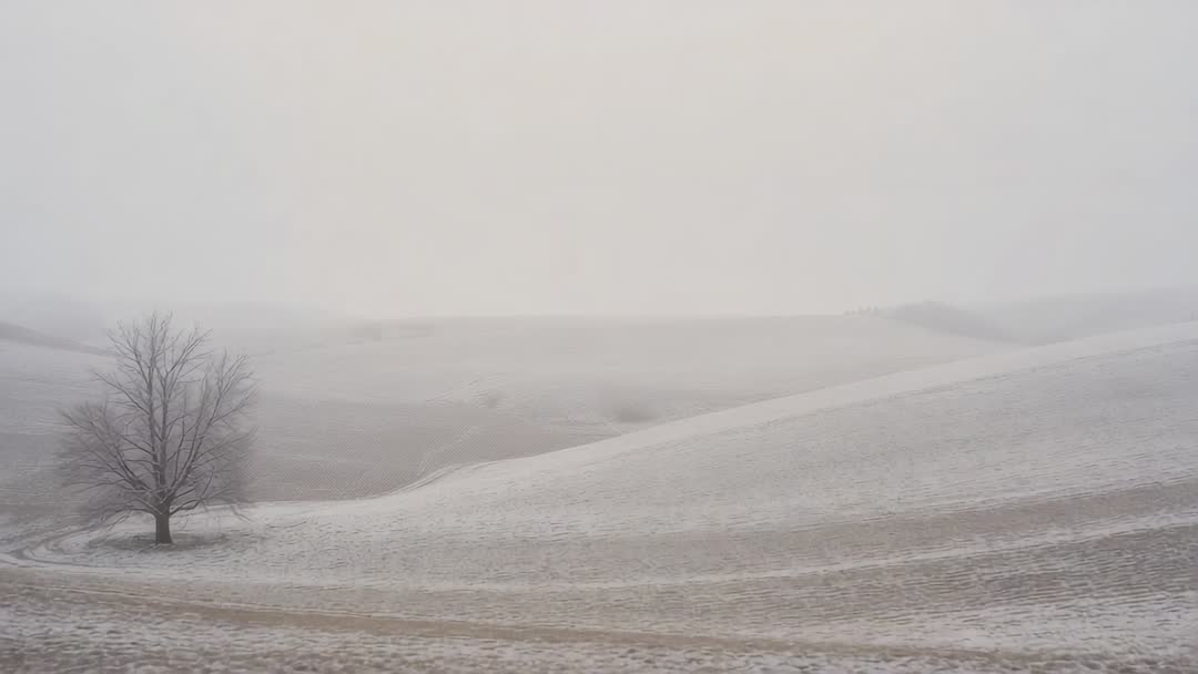 AI Generated Video. Quiet winter video clip showing fog drifting across frosted rolling fields with solitary leafless tree beside winding track. Minimalist composition offering large negative space for text or overlays and keeping focus on texture of furrows and muted horizon. Palette featuring muted grays and warm beige undertones, enabling flexible color grading for colder or warmer moods. Use for website hero banners, blog headers, social media posts, or promotional spots focusing on travel, agriculture, mindfulness, or seasonal themes. Ideal for editorial spreads, environmental storytelling, weather segments, and background loops for meditation or corporate presentations. Clip supporting slow pan, subtle zoom, or looped playback; compatible with wide crops and cinematic letterbox formats.