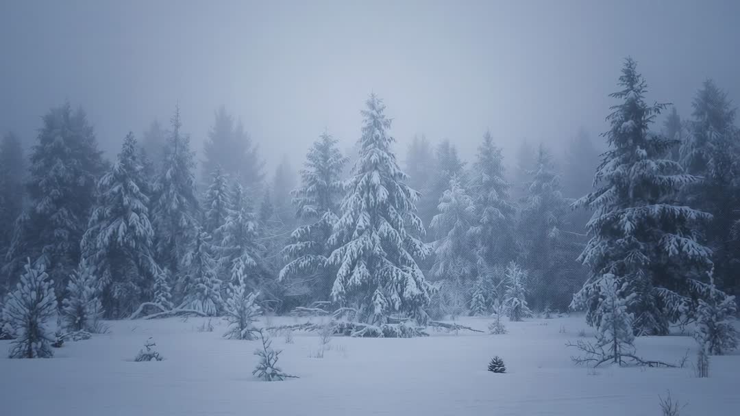 AI Generated Video. Slow cinematic nature clip showing fog drifting through snow-covered boreal forest with central evergreen carrying heavy snow. Soft blue-gray palette creating moody, tranquil atmosphere and deep sense of solitude. Clip suiting use as website hero background, header video, seasonal marketing campaign, holiday greeting animation, film opener, nature documentary intro, meditation or relaxation app loop, social media reel, or book and album motion cover. Color grading favoring cold tones, slow pan or subtle parallax adding depth, and ambient wind or soft synth sound design enhancing mood. Clip including AI generated tag for licensing and cataloging.