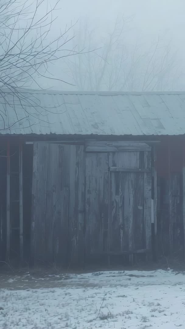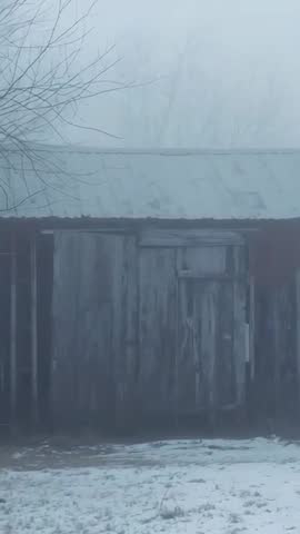AI Generated Video. Vertical footage showing fog drifting across weathered wooden shed with swaying bare branches and patchy snow beneath corrugated metal roof. Muted blue-gray palette and soft low-contrast light creating moody, quiet atmosphere. Useful for filmmakers and content creators needing moody rural B-roll, social media vertical stories, background for title sequences, seasonal intros, and atmospheric commercials. Loop-friendly slow motion potential, subtle movement providing space for text overlays and lower thirds. Suggested uses including music video interlude, mystery or horror teaser, weather segment, blog header about rural life, book cover art for atmospheric fiction, and branded vertical ads.