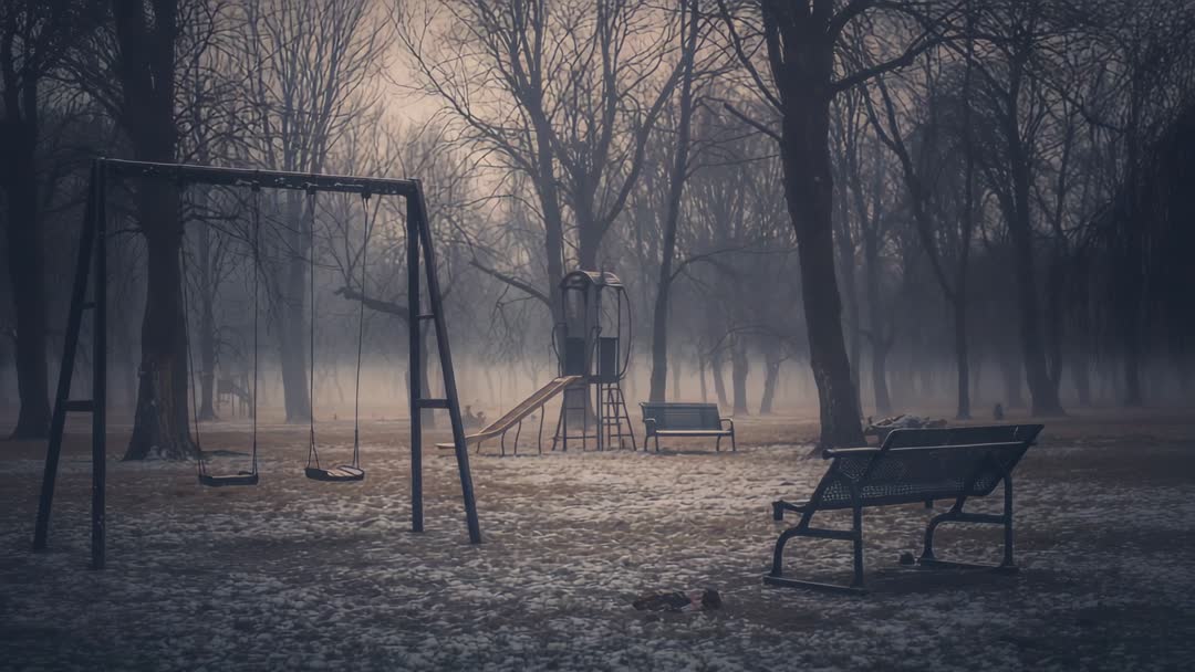 - Fog-lingering winter playground footage with empty swings swaying and benches waiting