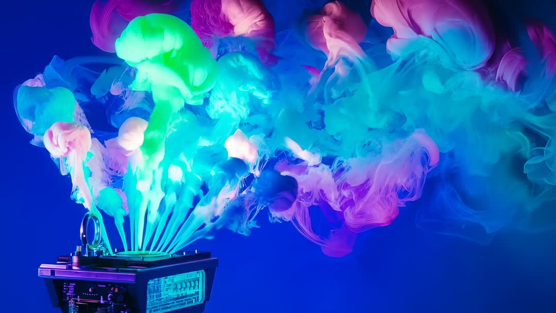 AI Generated Image. Video showing fog machine emitting neon cyan and magenta vapor plumes against deep blue backdrop. Bright RGB lighting mixing with dense mist, creating fluid abstract shapes and high-contrast color transitions. Close-up shot highlighting control panel and nozzle array, useful for equipment demo, tutorial, product showcase. Footage working well for music video intros, club and concert promos, DJ visuals, event trailers, theatrical title sequences. Suitable for looping VJ visuals, background layers for motion graphics, advertising banners, website hero headers, social media reels, and creative campaign assets. Editing tips: use slow motion, color grading, blending modes, mask overlays, and subtle particle effects to enhance depth and integrate with typography.