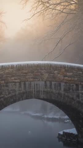 AI Generated Video. Video showing fog rolling through trees, sunrise light warming mist and revealing snow-dusted stone arch bridge lined with icicles. Portrait orientation vertical video capturing calm river reflections and frosty textures on stone and branches. Soft golden hour glow creating atmospheric contrast between warm sky and cold river surface. Useful for winter travel campaigns, seasonal social media reels, holiday greeting backgrounds, calming meditation and relaxation clips, environmental storytelling and landscape title sequences. Easy to crop for mobile ads, story posts, website hero banners, and editorial use in winter or weather articles.