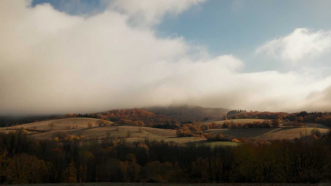 - Fog Rolling Over Autumn Hillside with Sunlit Foliage