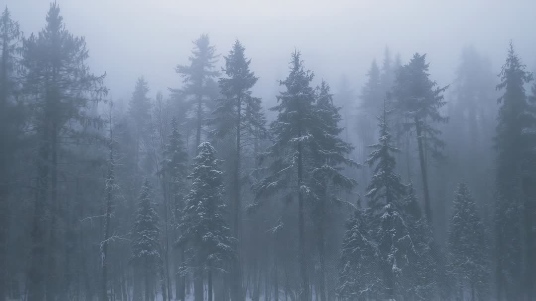 - Fog thinning over snow-dusted spruce and pine forest, misty boreal taiga aerial footage