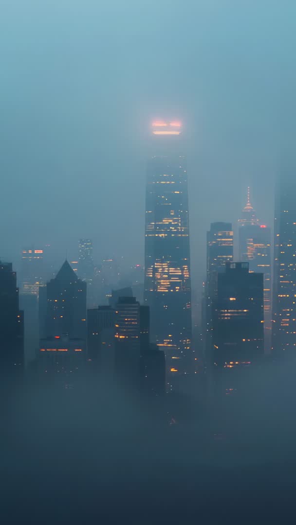 AI Generated Image. Vertical video showing fog thinning around skyscrapers with glowing windows from rooftop vantage. Scene creating moody, cinematic atmosphere with cool blue tones and warm interior lights breaking through mist. Footage suiting cinematic openers, urban lifestyle ads, travel promos, tech brand backgrounds, weather segments, and editorial pieces about city life. Working well for overlaying titles, lower thirds, rhythmic edits for social reels, and vertical ads across mobile platforms. Offering loopable clip options for website hero backgrounds, presentation backdrops, and gallery installations. Color grading suggestions: enhancing contrast, boosting teal shadows, warming highlights to emphasize window glow. Licensing ideas: commercial campaigns, film projects, broadcast segments, architectural portfolios.