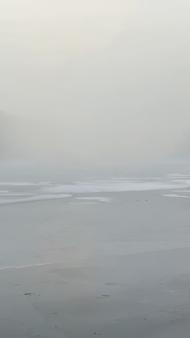 AI Generated Video. Showing foggy shoreline with wet sand and thin seafoam pools shifting across receding tide. Left side revealing faint cliff silhouette fading into mist. Soft gray palette and minimalist composition creating calm, moody atmosphere. Working well for vertical video projects such as mobile background, meditation app, mindful breathing guide, slow cinematic opener, travel reel, environmental story, social media ad. Allowing text overlay in upper area thanks to open negative space. Delivering tranquil coastal mood for branding, website hero, ambient loop, relaxation content, editorial on climate and coastal erosion.