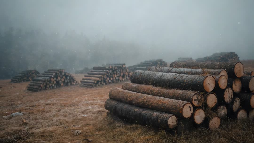 AI Generated Video. Footage showing stacked logs in foreground with repeating piles receding into foggy distance, light snowfall dusting bark and creating thin frost. Composition emphasizing texture of cut ends, concentric rings, and damp bark while muted color palette of browns and cool greys evokes quiet winter mood. Use for environmental documentaries, forestry industry promos, seasonal advertising, website banners, and social media backgrounds. Suitable for editorial pieces on logging practices, corporate sustainability reports, packaging or branding for wood product companies, and atmospheric openers for film or broadcast. Editing suggestions: add slow crossfade, ambient wind sound, or subtle color grade to enhance mood and depth.