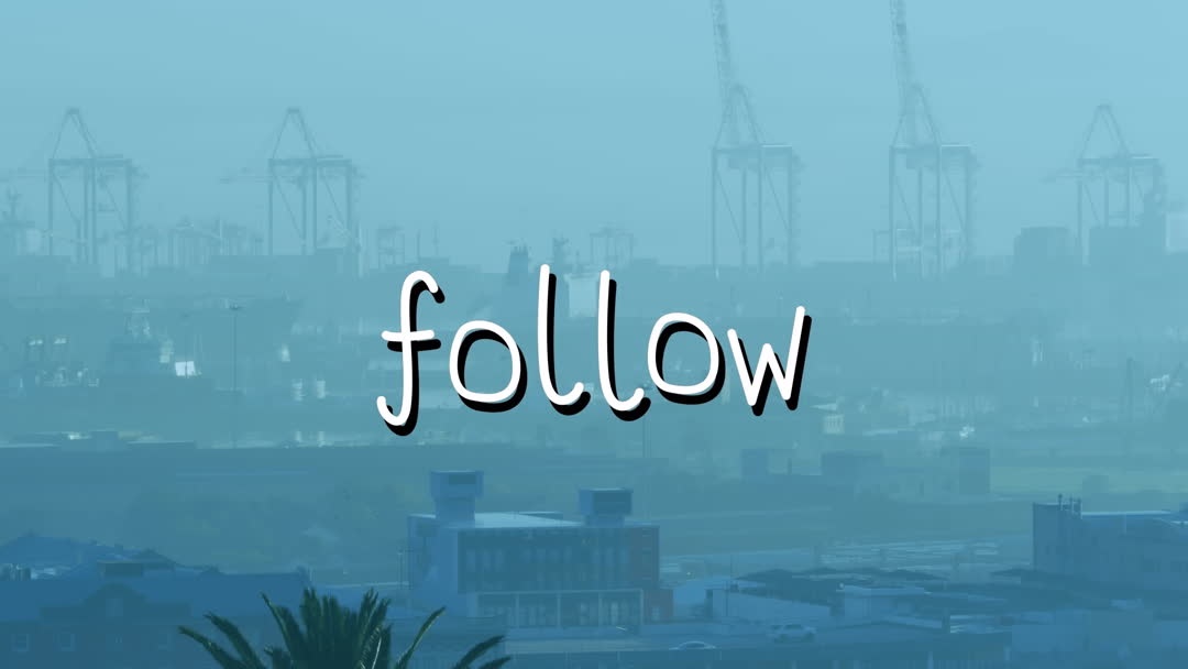 This scene depicts the word 'follow' animated over a hazy urban cityscape featuring industrial cranes in the background. The combination of modern typography and an industrial skyline evokes themes of global connectivity and technological advancement. This visual can be effectively used for business presentations, digital marketing materials, or projects focusing on following trends or leadership in an industrial context.