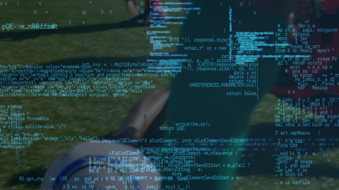 Focus on diverse football players with an overlay of data and coding elements illustrating the integration of technology and analytics in modern sports. Useful for themes related to sports technology, data analysis, innovation in athletics, and the future of sports. Ideal for articles, blog posts, or presentations dealing with artificial intelligence and tech development in the sports industry.