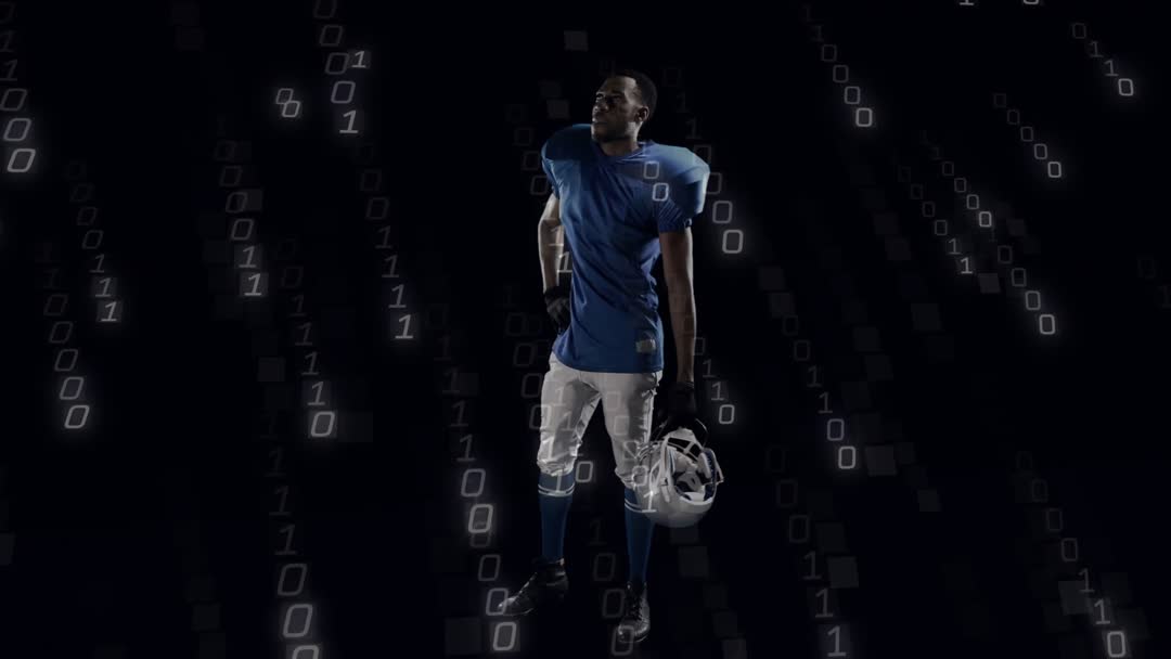 A football player in uniform lifts helmet amidst a backdrop of digital binary code cascading around him. This video symbolizes the intersection of sports and technology, shedding light on themes of modern analytics and esports. Perfect for illustrating sports technology integration, or as a visualization metaphor in technology-focused sports marketing and promotional events.