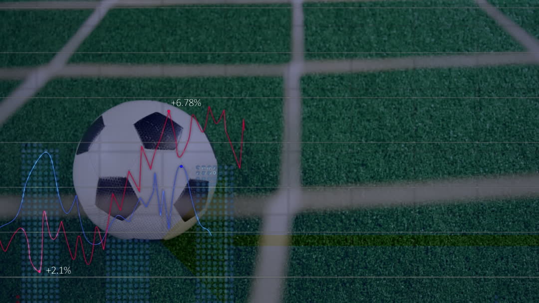 Overlay of statistical graphs on a football against a turf field, symbolizing the connection between sports and data analysis. Ideal for uses in publications on sports technology, football analytics, and the role of data in athletic performance enhancement. It can be used to illustrate themes like digital transformation in sports and economic impacts of global sports markets.