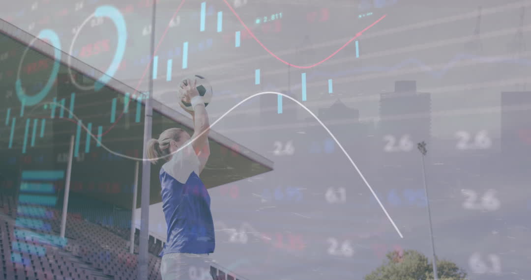 Dynamic composition featuring a football player throwing a ball in slow motion combined with digital rather analytical overlays. Represents concepts of global communication, technological innovation, and networking. Useful for articles on technology in sports, business enhancement through data analytics, or current digital interactions in team sports development.