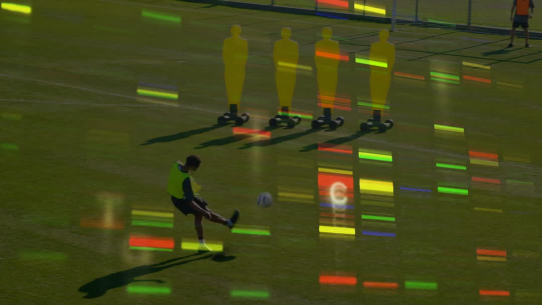 Football Player Practicing Shots with Digital Interface Overlay Video