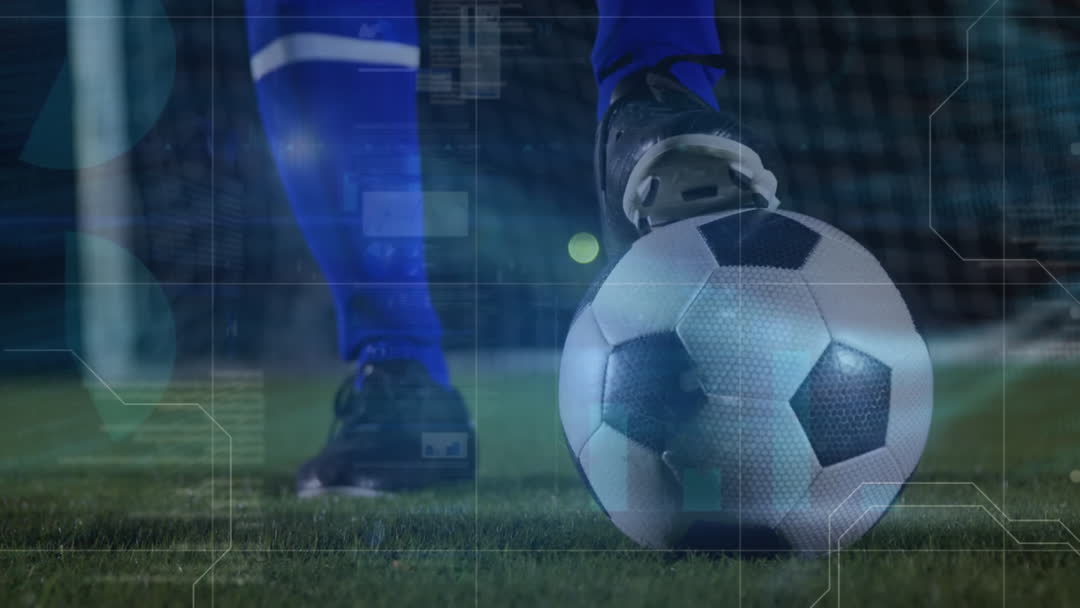 Animation of a football player preparing for a kick, with a visual overlay signifying financial digital data analysis and tech processing. Ideal for use in articles discussing the intersection of sports and technology, digital transformation in sports analytics, or advertisements for sports technology solutions.