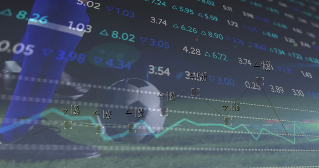 Visual portrays integration of sports with financial analysis, as a football player prepares to kick amidst an overlay of stock market graphs and figures. Useful for depicting the intersection of sports economy, trends in sports investments, and data-driven decisions in global sports markets.