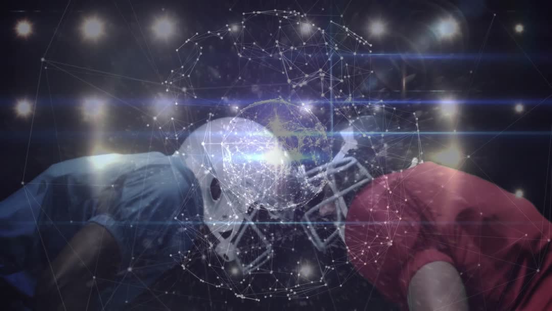 The scene shows two football players energetically touching helmets, highlighted by gleaming stadium lights. Outlined by a shimmering, rotating wireframe globe connecting sports tech and athletic performance, it ultimately communicates the junction of competition and innovation. Such videory serves best in illustrating content about sports technology, modern athletic advancements, and the essence of determination and pressure in competitive sports.