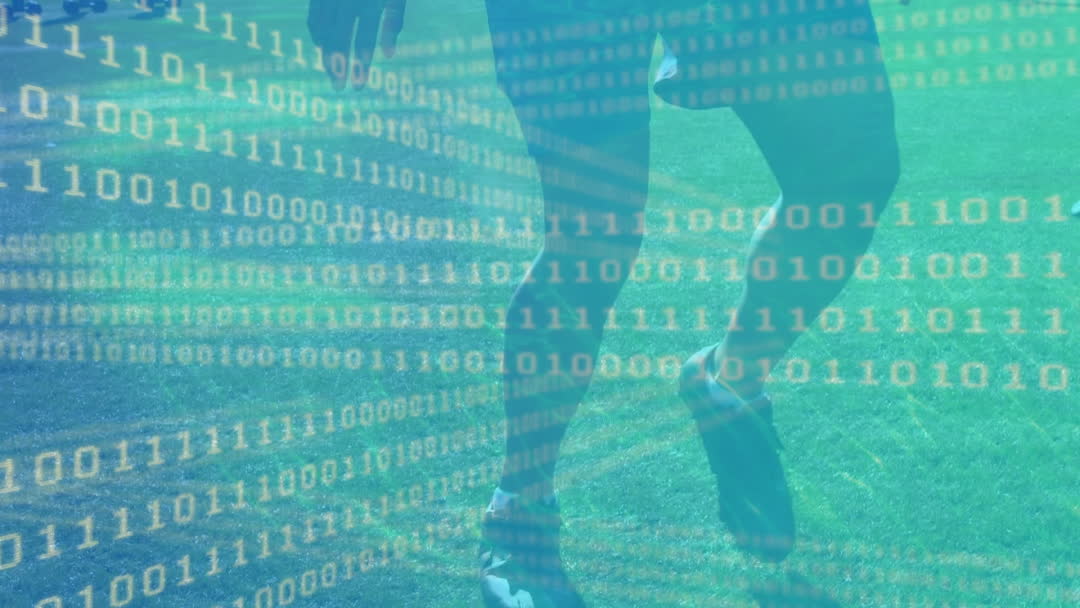 Football Scenes Merged with Digital Binary Code Overlay Video