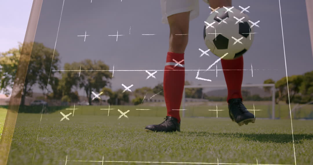 Football player standing on a soccer field with a digital game plan layout overlay offers a dynamic representation of sports strategy. Ideal for promoting sports analysis software, tactical training programs, or sports industry innovation. The visual concept of combining traditional sport with advanced digital planning aids athletic enrichment and strategic advancements.