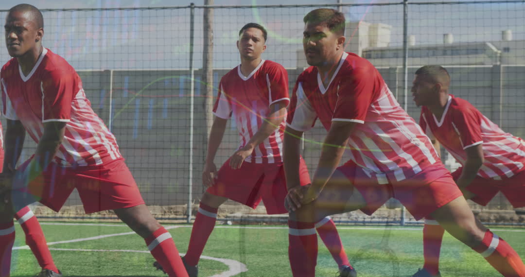 Group of diverse male footballers in red and white uniforms stretching on an outdoor pitch with a digital interface overlay, symbolizing the intersection of sports and technology. Ideal for illustrating concepts related to athletic performance, sports analytics, football team dynamics, fitness training, and the integration of tech in sports.