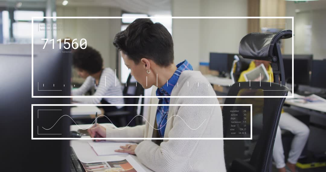 Clip showing woman leaning over desk and writing while HUD overlays projecting numeric readouts and wave graphs across screen. Background featuring colleagues working at monitors in open plan office, creating sense of teamwork and productivity. Visual style combining real workspace footage and futuristic data overlays, supporting themes of analytics, UX design, and workplace technology. Useful for corporate presentations, product demos, startup pitch videos, recruitment campaigns, training modules, marketing banners, and website hero content. Licensing options allowing use in commercial projects, social media ads, explainer videos, and editorial coverage of workplace innovation.