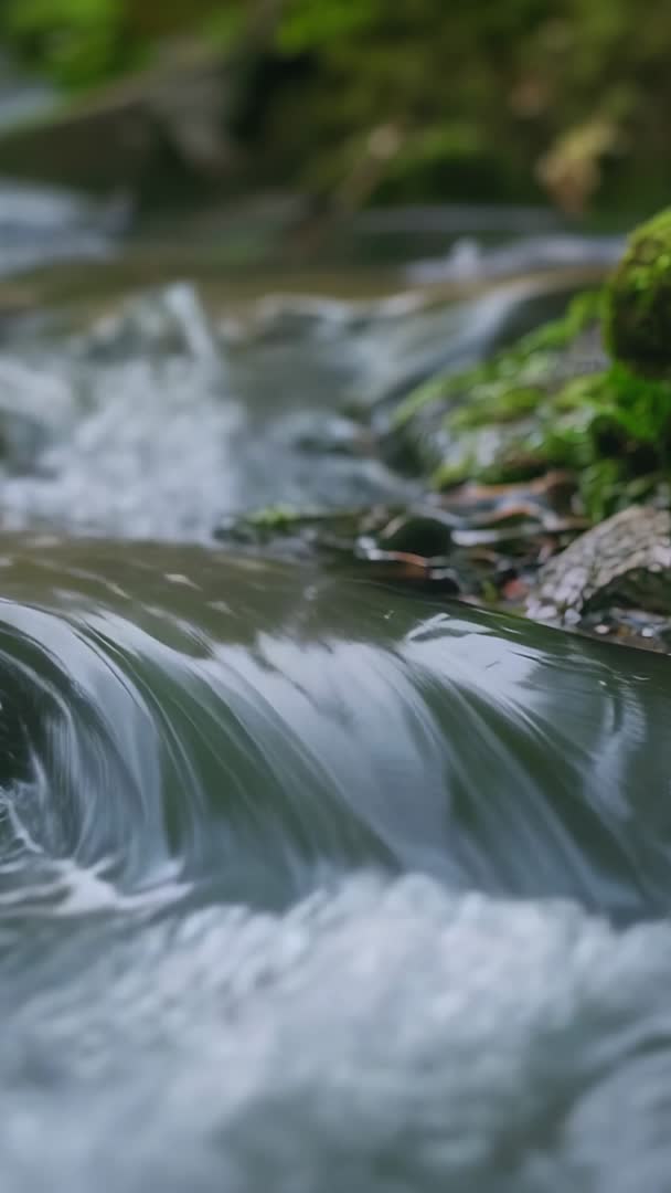 AI Generated Video. Showcasing forest creek flowing over rock lip and forming silk-like water sheet with frothy foam, close-up vertical framing. Shooting in slow-motion style to capture silky flow, motion blur, and fine water texture against moss-covered stones and fallen leaves. Providing calm ambient footage for wellness and meditation projects, spa promotions, nature documentaries, and social media reels. Working well as looping background for relaxation playlists, website hero sections, or on-screen overlays with lower third text placed in blurred upper area. Allowing color grading toward cool green tones for eco messaging or warm tones for commercial lifestyle use.
