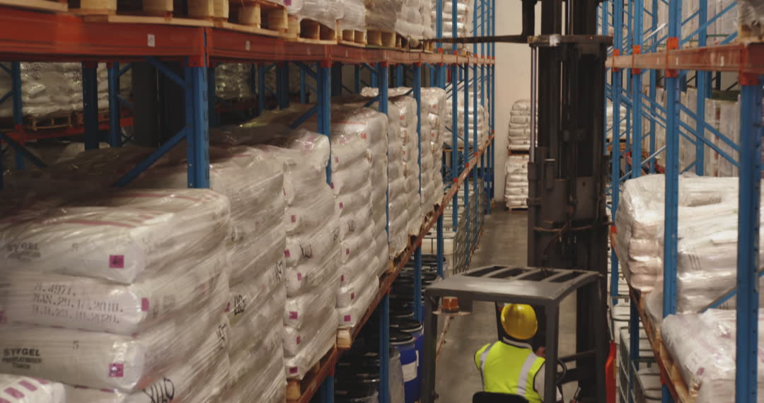 - Forklift Navigating Warehouse Aisle for Cargo Distribution