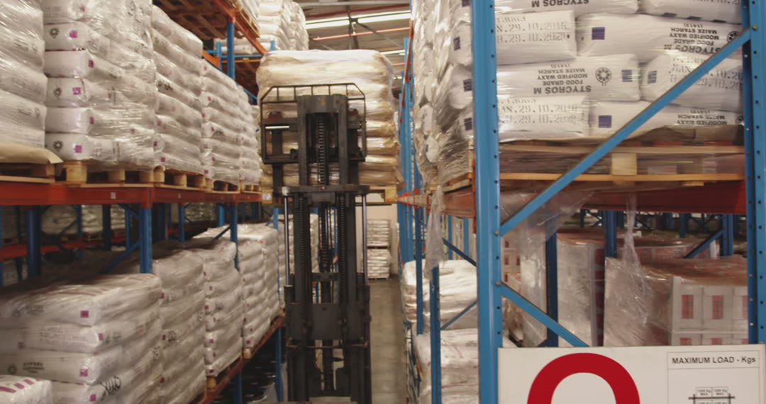View of forklift lifting pallet of sacks in large industrial storage warehouse. Image showcases organized inventory management within logistics and freight transportation environment. Useful for illustrating supply chain management, warehouse technology, or efficiency in storage solutions for logistics companies, industrial equipment, or distribution networks.