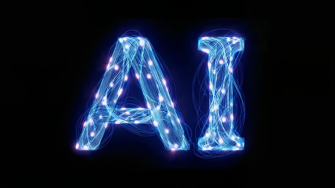 - Forming glowing AI letters with neon filaments and pulsing nodes, circuitry typography animation