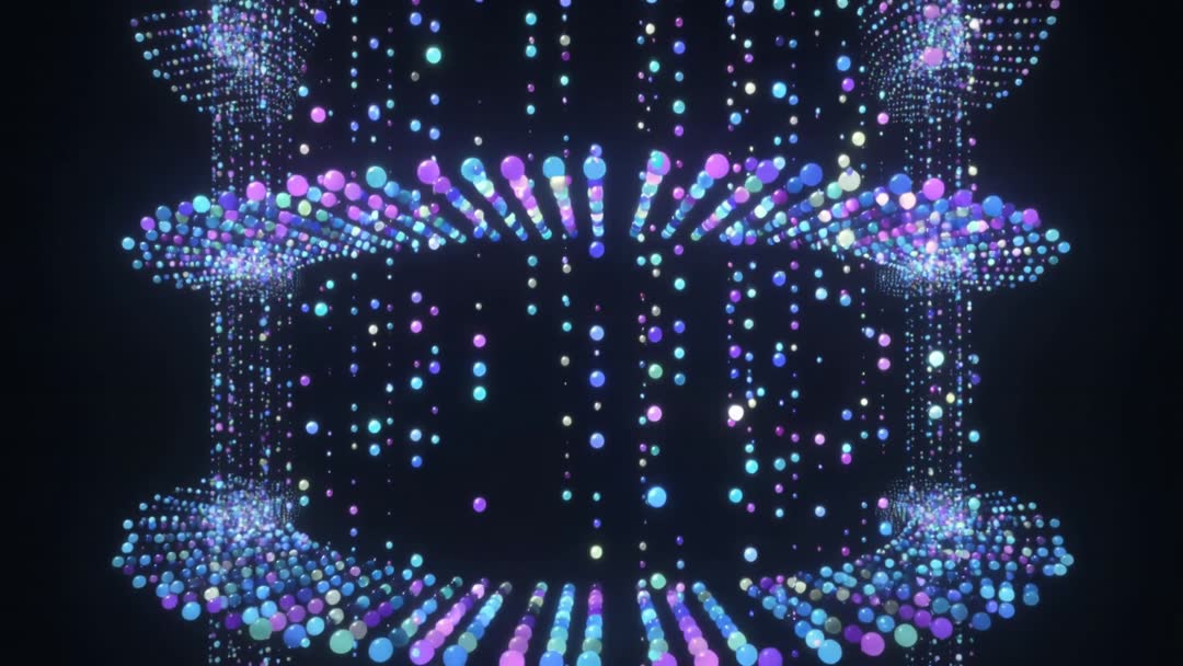 AI Generated Image. Video showing neon particles assembling into expanding ring inside dark void. Symmetrical 3D matrix of glowing spheres rotating and pulsing in purple, blue, cyan palette. Looping seamlessly for use as background in tech presentations, sci-fi title sequences, music visualizers, event projections, website headers, social media clips. Providing clear central space for overlaying logos, titles, product shots. Allowing easy color grading and speed adjustment to match brand tone. Suggesting export in MP4 H.264 or ProRes for high-quality playback, and loop length between 8 and 30 seconds depending on usage. Pairing with ambient synth or electronic sound design to enhance immersive mood.