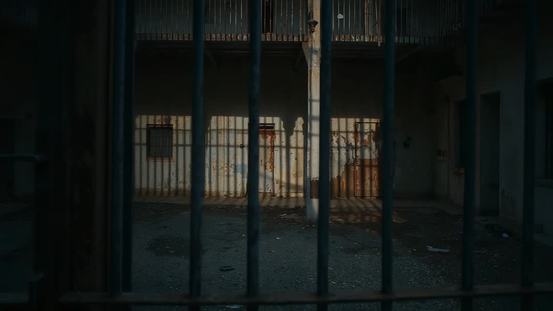 AI Generated Image. Video showing iron bars framing abandoned prison courtyard, late sunlight casting long shadows across rusted doors and peeling paint. Scene evoking confinement, neglect, urban decay, and tense atmosphere with gritty textures and moody contrast. Footage working well for crime drama, documentary sequences, historical features, industrial promos, or background for tense storytelling. Editors using as establishing shot, transition clip, background loop, or overlay for titles and narration. Post-production suggestions: increase contrast, deepen shadows, apply cool or warm color grade depending on desired mood. Usage ideas: social issue campaigns, museum exhibits, film projects, news reports, urban exploration features, or dramatic marketing visuals.
