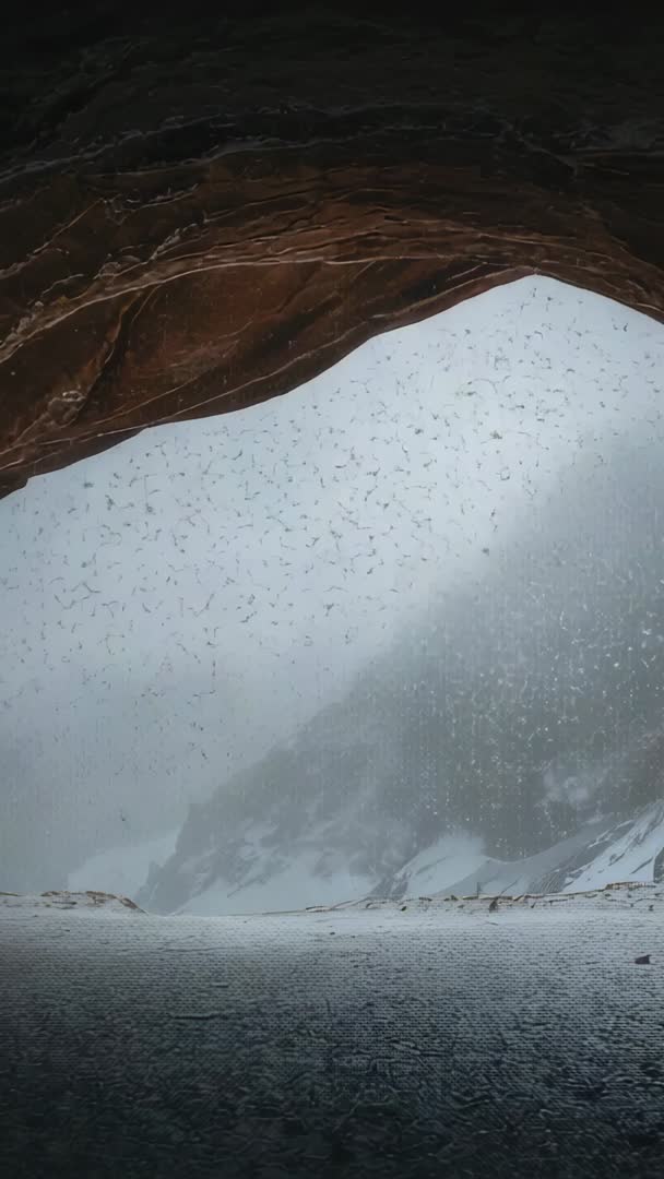 AI Generated Video. Framing rock alcove foreground with curved stone arch crowning top, capturing drifting snowflakes sweeping across cracked ice toward distant mountain ridge. Pale winter light creating muted blue-gray palette and strong contrast between warm brown stone and cool frozen surface. Snow flurries appearing as fine specks moving through misty atmosphere, conveying harsh alpine weather and remote wilderness mood. Suiting travel and adventure promos, weather and nature documentary openers, social media vertical reels, mobile app backgrounds, vlog intros, and environmental campaign visuals. Working well as atmospheric background for title cards, slow-motion loops, parallax transitions, or full-screen hero banners. Highlighting vertical composition optimized for smartphone screens and reel formats, offering easy placement for text overlay in upper area and logo reveal at lower area. Looping potential and subtle motion making clip ideal for ambient scenes, dramatic openers, or seasonal marketing content.