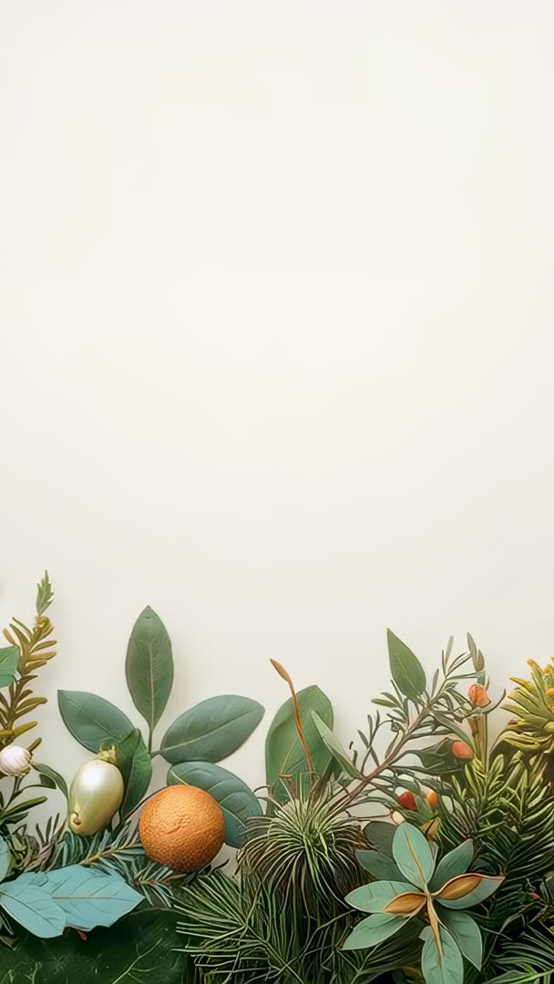 AI Generated Video. Vertical video showing botanical border along bottom of cream background, leaving generous copy space above for text or titles. Composition featuring eucalyptus leaves, pine needles, air plant, small gold ornament and orange citrus accent, creating warm neutral palette with subtle holiday vibe. Ideal for social media stories, Instagram reels, mobile ads, seasonal promotions, wedding invitations and product mockups. Composition using bottom-aligned botanical frame to draw viewer eye upward, allowing easy placement of headline, logo or animated text. Colors and negative space working well for minimal branding, eco product campaigns, seasonal menus and lifestyle blog headers. Video-compatible format suitable for looping background or short motion reveal.