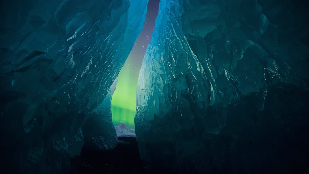 - Framing Glacial Ice Tunnel Revealing Aurora Borealis Dancing Over Snow Ridge at Night