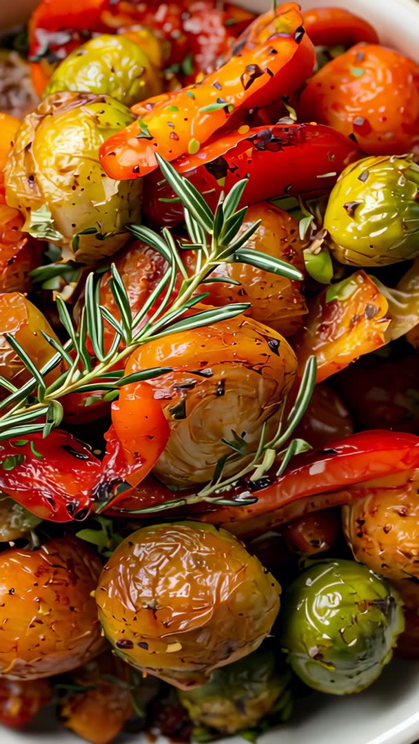 AI Generated Video. Showcasing caramelized brussels sprouts, charred red pepper, and fresh rosemary with glossy balsamic glaze while camera slowly zooming for cinematic closeup. Featuring warm studio lighting, rich color saturation, and shallow depth of field to highlight texture and sheen. Perfect for social media reels, recipe intros, cooking tutorials, restaurant menu promos, packaged food advertising, and seasonal holiday content. Suggesting use of slow motion, subtle pan, or text overlay for ingredient callouts and step-by-step cooking captions. Recommending 9:16 vertical crop for mobile-first platforms, 10-30 second clip length, and upbeat acoustic or ambient music to enhance appetite appeal. Delivering versatile footage for editorial food features, commercial campaigns, and influencer food storytelling.