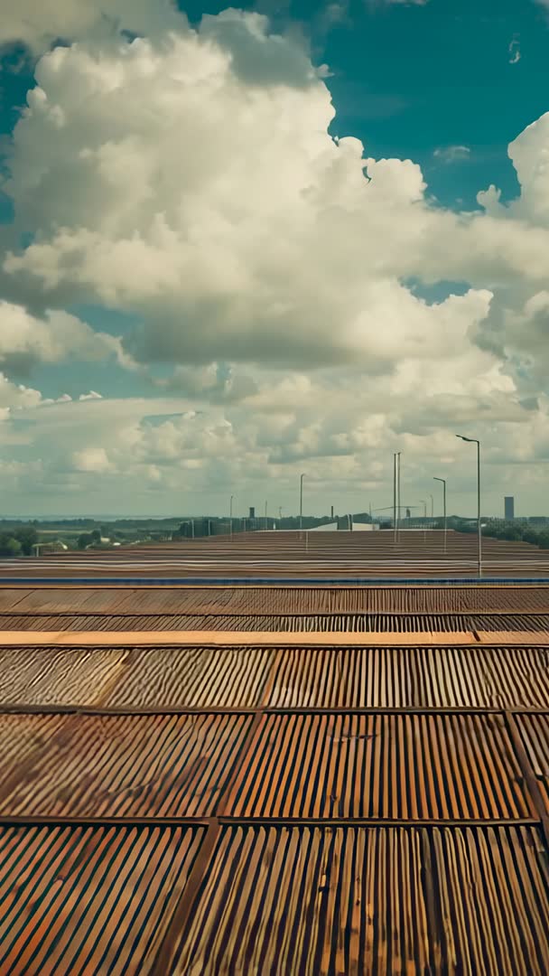 AI Generated Image. Vertical aerial video capturing rusted corrugated metal roof from above, clouds drifting across wide teal sky, street lamps receding toward horizon. Ribbed metal panels creating strong leading lines, guiding eye from foreground to distant urban edge. Weathered texture and warm rust tones contrasting cool sky tones, creating cinematic teal-and-orange mood. Scene suiting use as vertical background for mobile ads, social media reels, website hero banners, architecture and infrastructure projects, industrial marketing, drone footage compilations, environmental storytelling. Negative space within cloudscape providing clean area for overlaying titles or captions, while rooftop foreground offering textured lower-third for logo or call-to-action. Suggesting color grading to enhance teal-and-orange contrast and adding subtle camera push or time-lapse speed ramp for dynamic edit.
